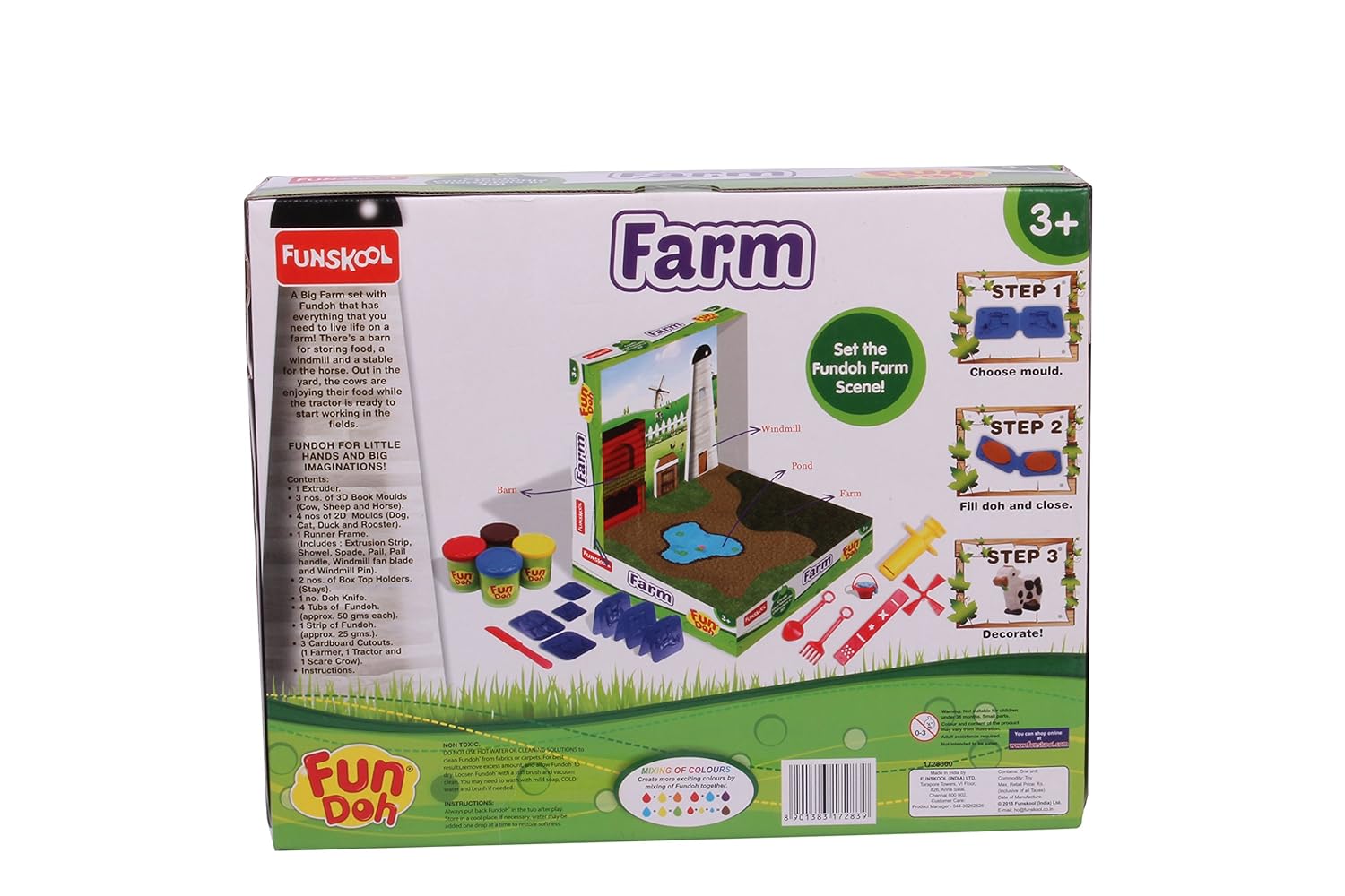 A big farm set with Fundoh that has everything that you need to live life on a farm. There’s a barn for storing food, a windmill and a stable for the horse. Out in the yard, the cows are enjoying their food while the tractor is ready to start working in the fields.