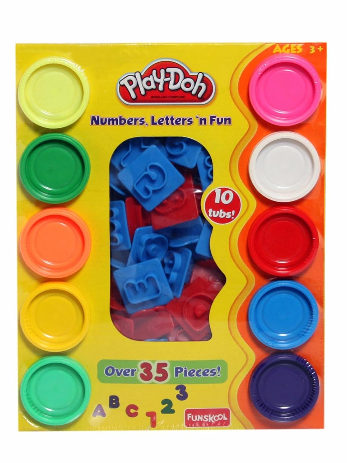 - Includes Play-Doh plastic knife for cutting, nine number moulds, 26 letter moulds and eight 1-ounce cans of colorful Play-Doh