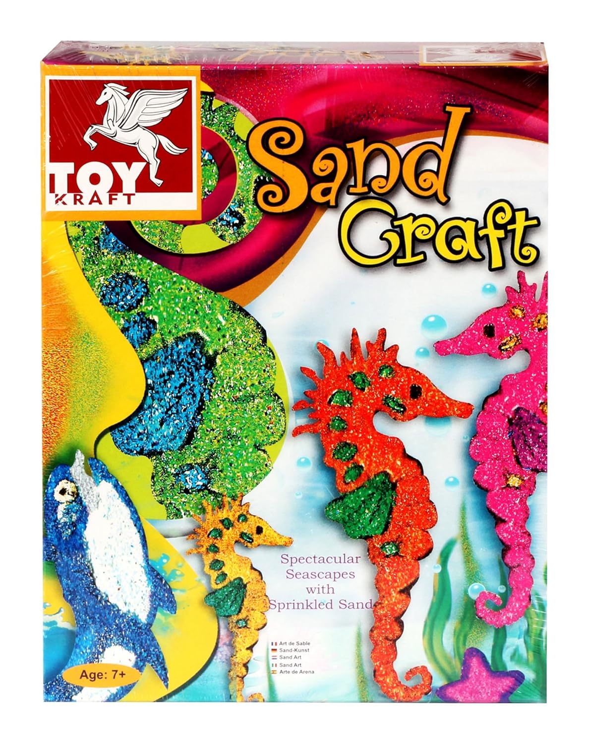 - Included Components: 5 pre-printed aquatic picture templates, 7 different coloured sand in sachets, 1 jar of white adhesive, 1 paint brush, 1 miniature funnel, instruction manual and 1 spatula