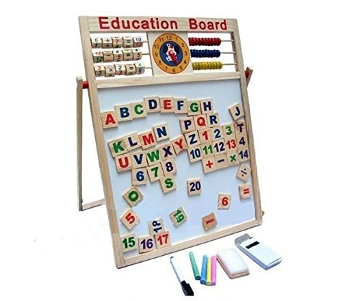 This is a most wonderful gift you can give to your child - The Double Sided Wooden Framed Writing Board. One side consists of White Board with Magnetic letter and number blocks, sign blocks, eraser and sketch pen and other side is a black board with Color chalks, with which to write or draw. On top of this writing board is an Abacus along with a Calculating panel with mathematical symbols and numbers which is useful for mathematical calculations, a clock and English alphabets.