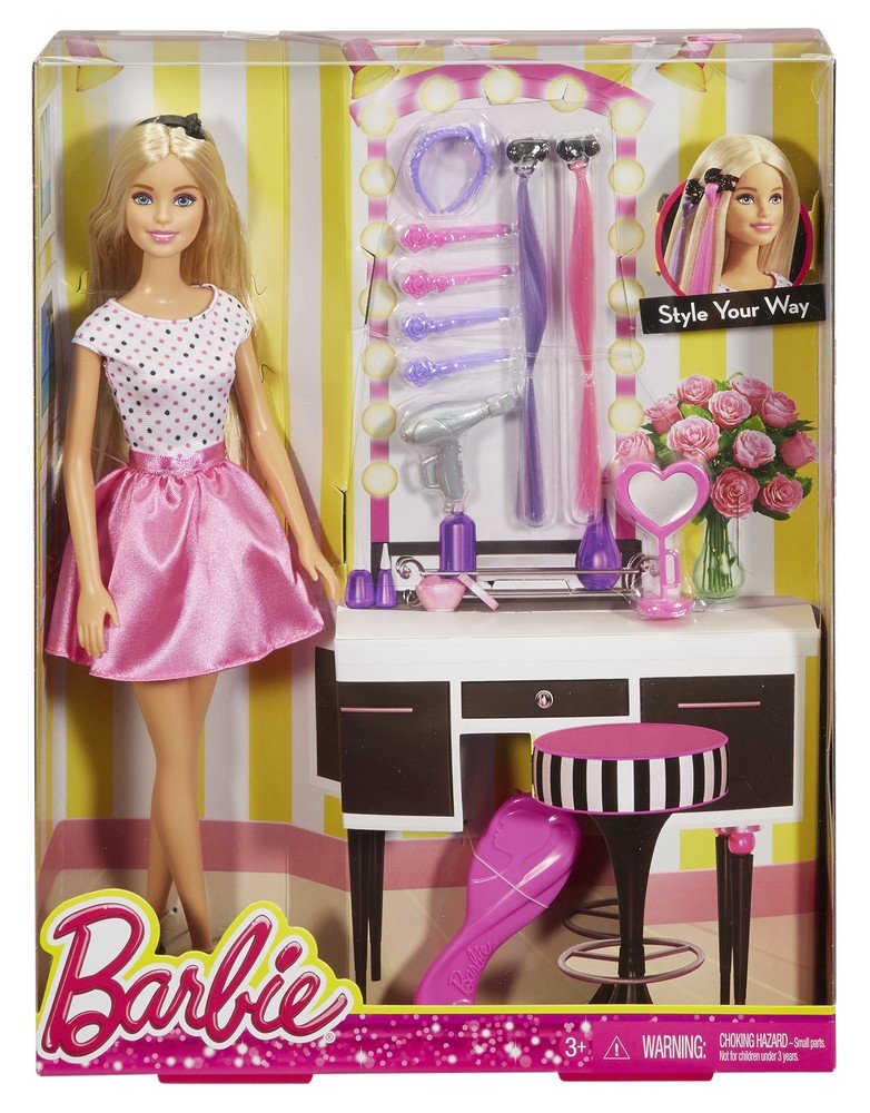 Barbie doll’s look simply by changing her hair. Barbie doll comes with lots of glam accessories to create a new do with ease. A hairbrush and doll hair dryer let young stylists play out the prep on Barbie doll to get her ready for any occasion. A collection of clips and accessories lets them add shape and color. Choose from two hair color extensions in signature pink and purple, two sets of hair clips with decorative detail and an adorable head band with bow. When the look is complete, Barbie doll can check it out in the heart shaped mirror place it in her hand for added realism. Dressed in a fabulous outfit of pink shimmery skirt, print top and cute shoes, Barbie doll will be ready to head out with fabulous hair or you can take it down, brush it out and start all over for tons of hairstyling fun. Set includes Barbie doll wearing fashions and accessories, two clip in hair extensions (purple and pink), two sets of hair clips (purple and pink), one head band, one doll blow dryer, one doll mirror and a hairbrush. Doll cannot stand alone. Colors and decorations may vary. Features: Change Barbie doll’s look simply by changing her hair. Girls can create endless hairstyles for Barbie doll with these amazing hair accessories and styling tools. A hairbrush and doll hair dryer let young stylists play out the prep on Barbie doll to get her ready for any occasion. Add shape and color with two hair color extension clips in signature pink and purple, two sets of hair clips with decorative detail and an adorable head band with bow. Barbie doll is ready for anything in a pink shimmery skirt, print top and cute shoes. Simply brush out Barbie doll’s hair to start all over for tons of hairstyling fun.