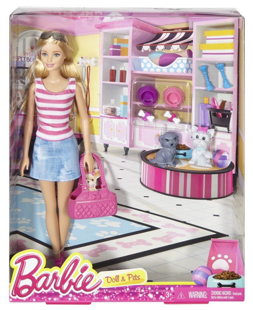 So doggone cute. Barbie doll and her sweet pups are ready for adventure anytime, anywhere. Girls can create endless stories with Barbie doll and her two pet puppies whether at home or on the go. Play out routine care or fun puppy tales. Adorable animal accessories include two water bowls, two bones, two puppy toys and a puppy carrier that fits both dogs. Barbie doll is ready to take them on a walk or an adventure dressed in a striped tank, denim skirt and cute shoes plus a pair of sunglasses for a beautiful, sunny day. Animal lovers will find lots of possibilities for pet play with this complete set. Includes Barbie doll, two puppies, pet carrier, animal treats, water bowls and puppy toys. Woof. Doll cannot stand alone. Colors and decorations may vary. Features: Barbie doll and her adorable pups are ready for adventure anytime, anywhere. Girls can create endless stories with Barbie doll and her pups whether at home or on the go. Adorable animal accessories include two water bowls, two bones, two puppy toys and a puppy carrier that fits both dogs. Barbie doll is ready to take them on a walk or an adventure dressed in a striped tank, denim skirt and cute shoes plus a pair of sunglasses for a beautiful, sunny day. Animal lovers will find lots of possibilities for pet play with this complete set. Legal line: Barbie and associated trademarks and trade dress are owned by mattel.