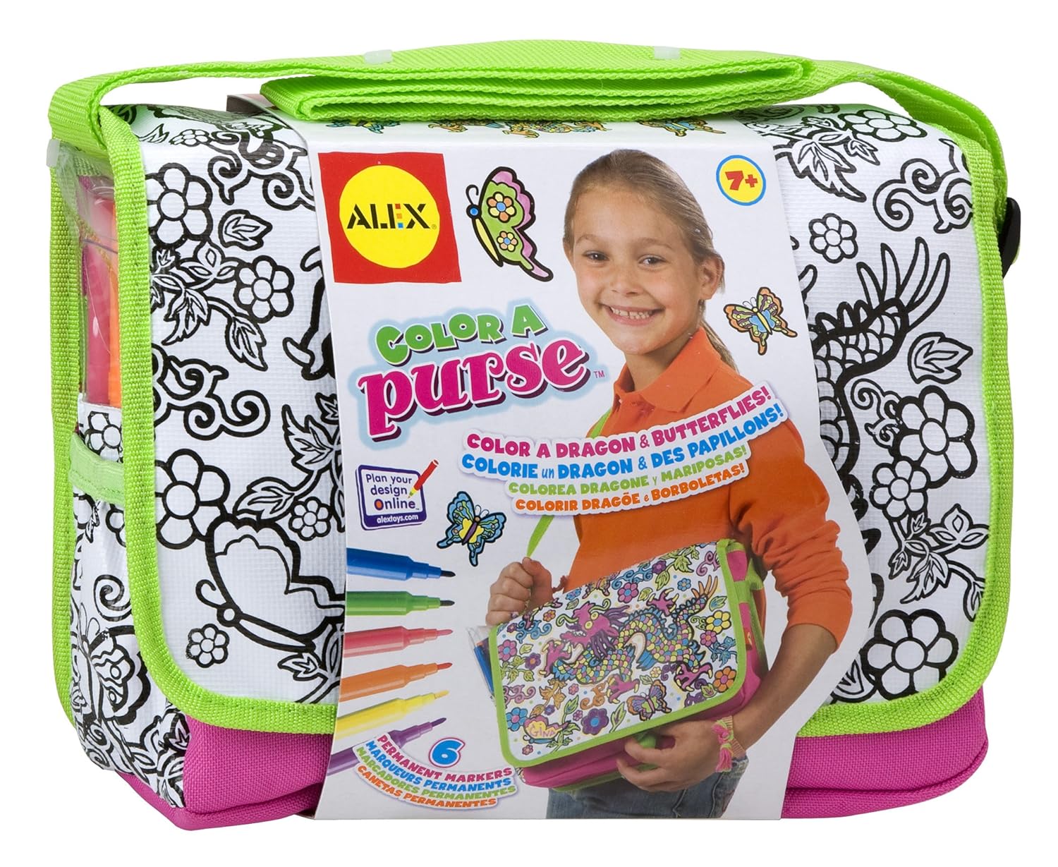 Create your own stylish purse by coloring in butterflies, dragons and flowers!